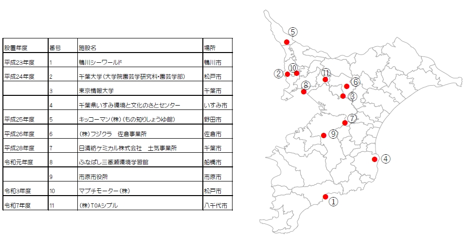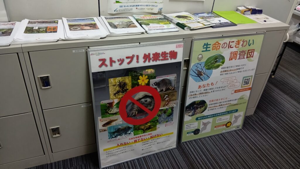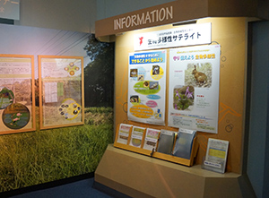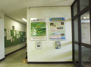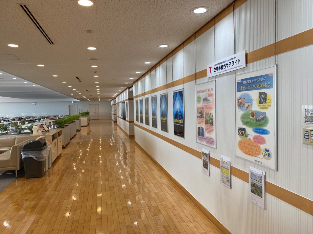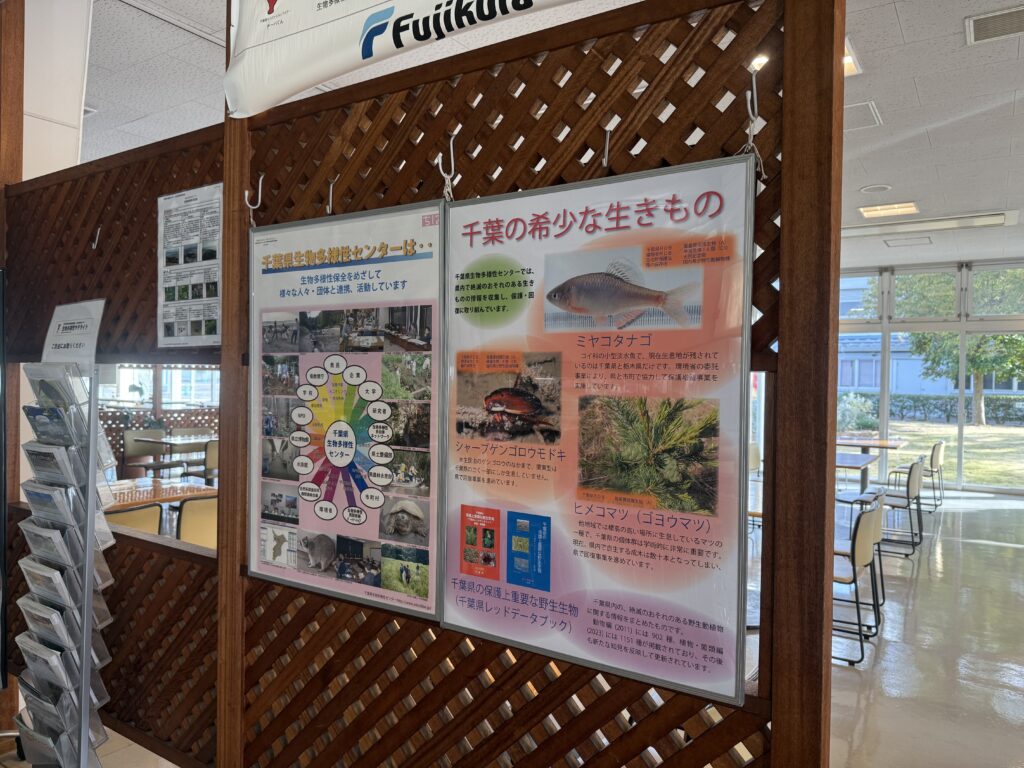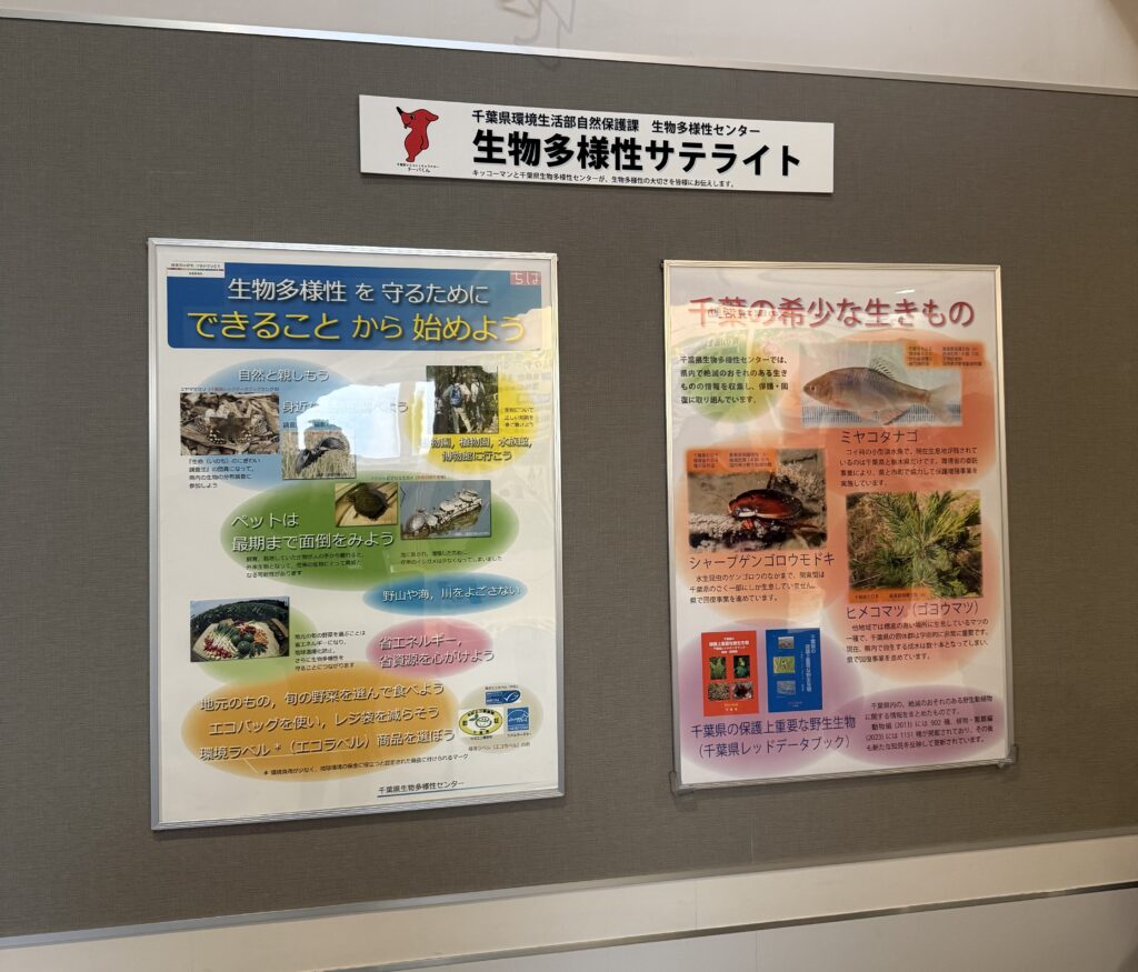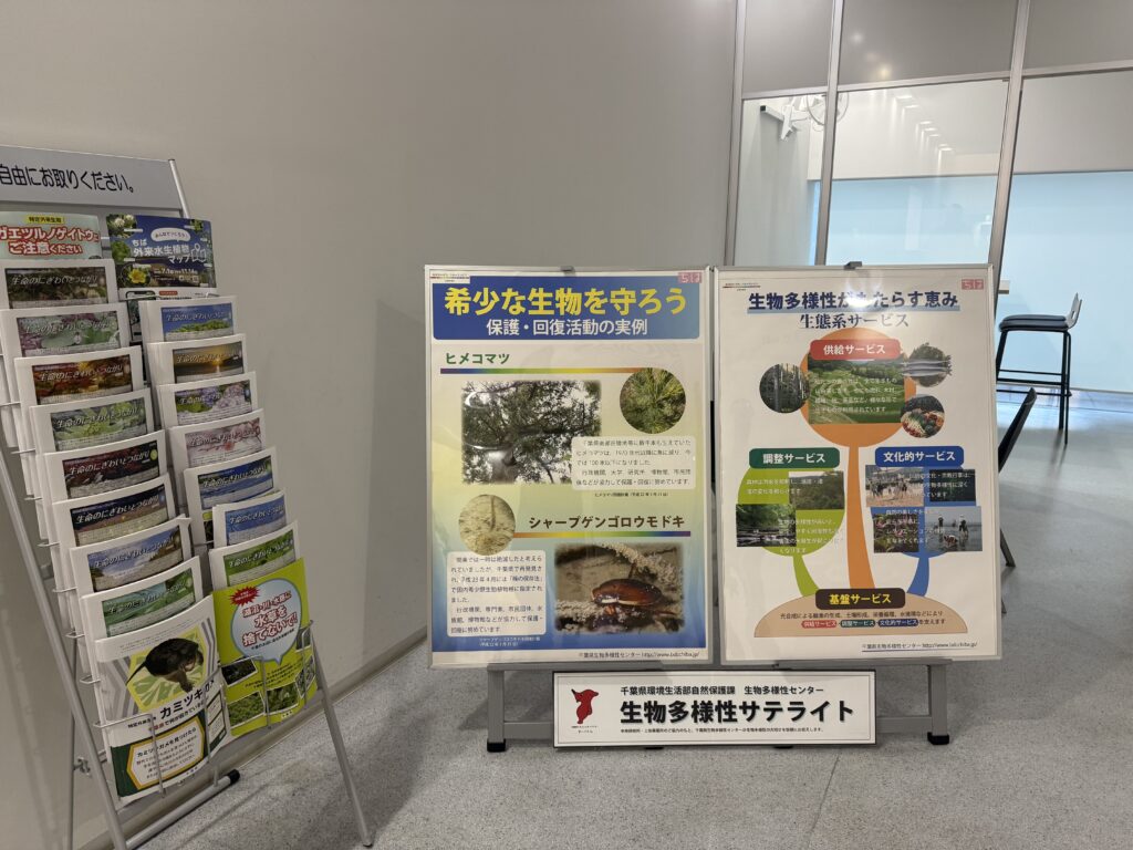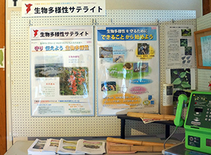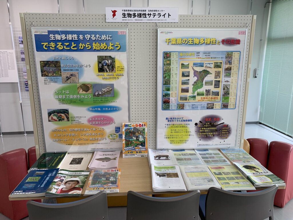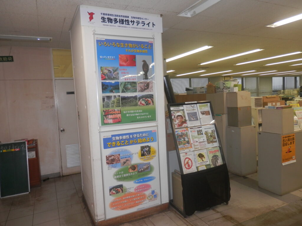 生物多様性の普及啓発を目的として、平成23年度から県内各地で開設している常設展示です。当センターが制作した生物多様性に関連するポスターを掲示するとともに、ニュースレター『生命のにぎわいとつながり』や『生命のにぎわい調査団』入団申込書などを配布しています。今後も随時、連携協定を結んでいる大学や、生物多様性ちば企業ネットワークのメンバーをはじめとする機関など、新しい場所を募集して設置していきます。