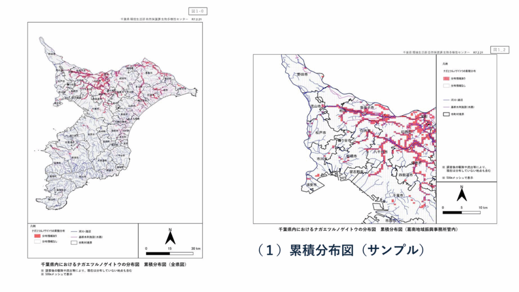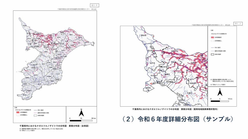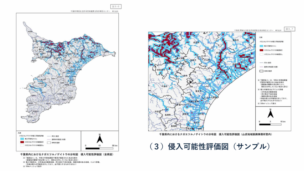 この度、調査結果に基づき、これまでに分布が確認された全地点(累積)、令和6年度に確認された分布状況、令和6年度の状況を踏まえた侵入可能性のある地点、の3種類について、いずれも500メートルメッシュの分布図を作成しましたので公開いたします。